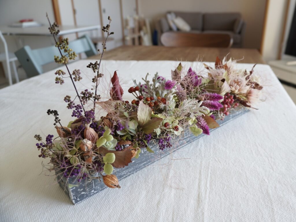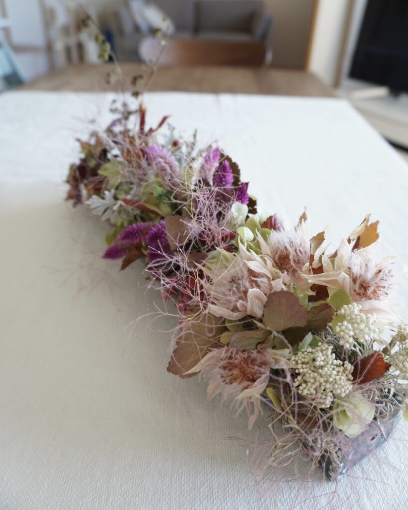 サイズ横40×幅5cmの花器を使用、仕上がりは横40×幅15×高さ20程度になります