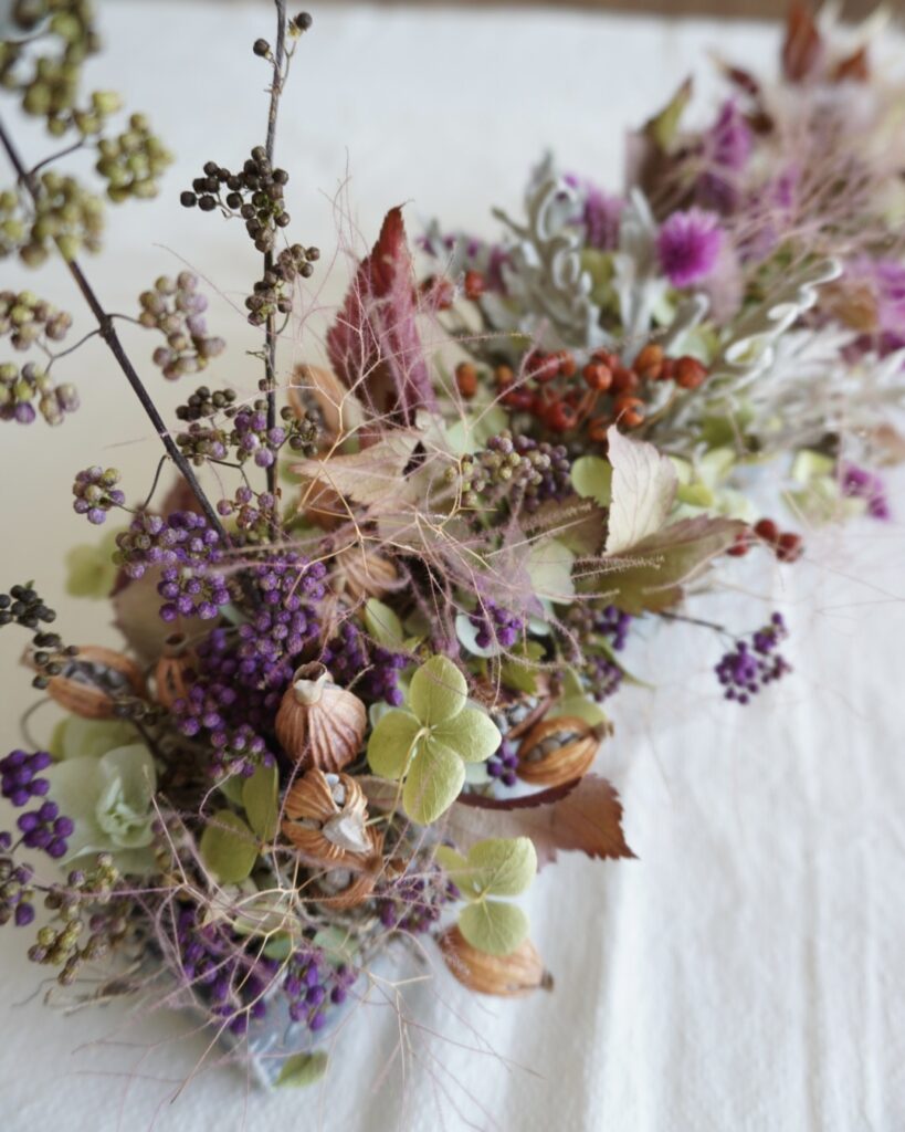 10月は深い色味のうっとりカラーで秋の実物も使ったアレンジメントをご用意しました。